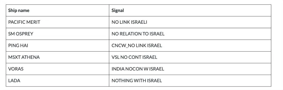 אניות סוחר משדרות דרך מערכת ה-AIS שהן אינן קשורות לישראל במאמץ להימנע מתקיפות חות׳ים עליהן כשהן במעבר באזור ים סוף דוגמאות לשידורי אניות בעת מעברן