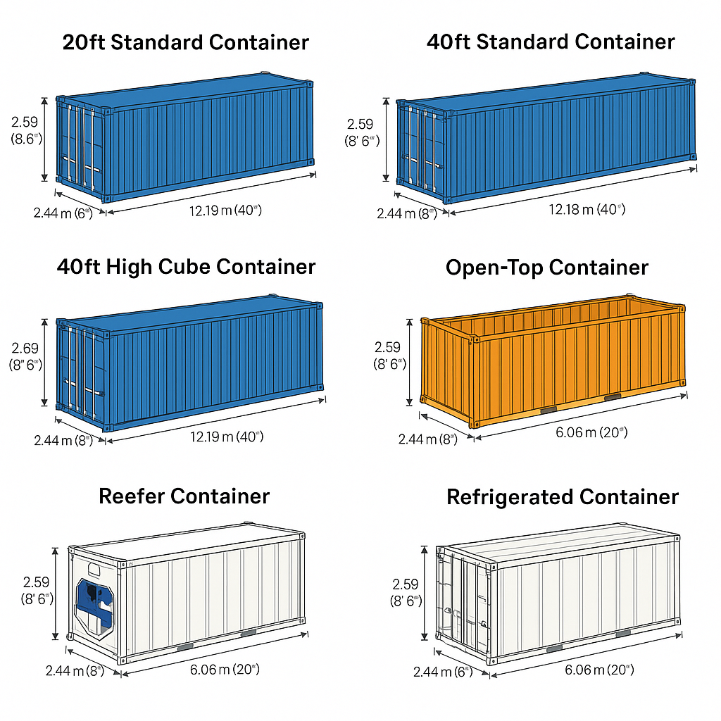 האיור מציג בצורה ויזואלית את מידות המכולות הסטנדרטיות: 20ft, 40ft, High Cube, מכולה פתוחה (Open Top) ומכולה בקירור (Reefer). כל מכולה מתאימה לסוגי מטען שונים לפי גובה, אורך, רגישות לטמפרטורה ואופי השינוע.