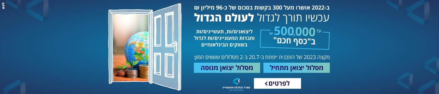 ההרשמה למסלולי המימון והליווי של מינהל סחר חוץ במשרד הכלכלה והתעשייה תיפתח ב-20.07.23, למשך חודש ימים בהליך תחרותי.