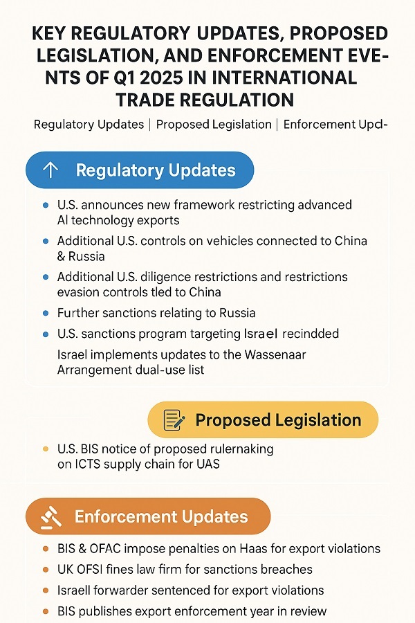 The first quarter of 2025 brought significant changes in global trade regulations, including tighter enforcement, new tariff regimes, and expanded sanctions frameworks. Major powers like the U.S. and the EU intensified controls over sensitive technologies, imposed sweeping sanctions on Russia, and introduced additional restrictions against China. Meanwhile, Israel experienced both opportunities and compliance challenges. This article provides a comprehensive overview of the key developments and their implications.